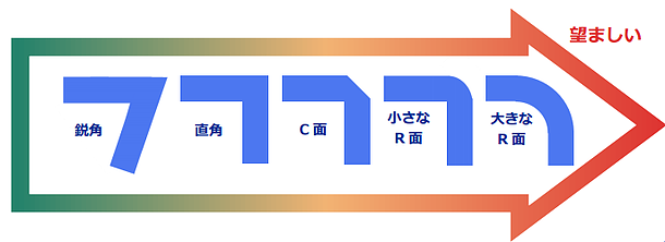 また、鋭角のエッジ部は割れやすいので可能な限りC面やRをつけるようにしてください。アルマイト処理をする部品のエッジ部分の角度が小さいと正常な皮膜が生成されにくくなります。(つきまわり性が悪くなります)