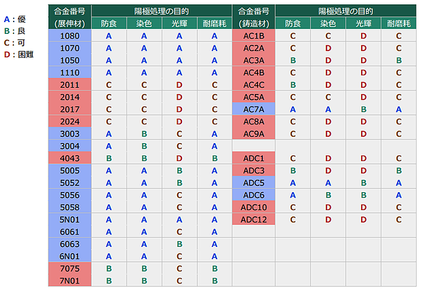 アルマイト皮膜は素材を酸化させて成長する皮膜のため、材質により皮膜性能が異なります。