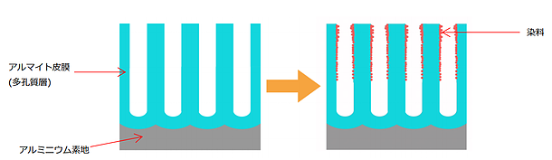 アルマイト皮膜は無数の微細孔が開いており、孔内部に染料を吸着させることで着色しています。