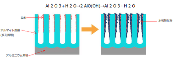 アルマイト皮膜の封孔処理とは、皮膜にある無数の孔(ポア)内部に「ベーマイト」と呼ばれる水和酸化物を生成・析出させる事によって、アルマイト皮膜表面を化学的に不活性な状態にする処理のことです。