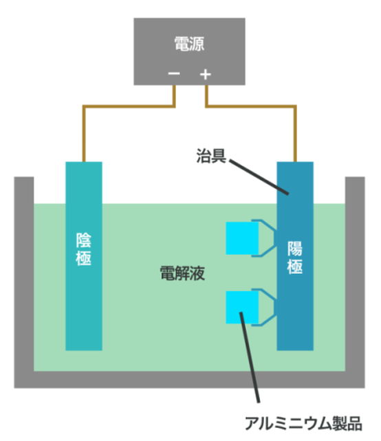 アノード酸化とも言い、英語では「anodizing」や「anodic oxidation」と言います。